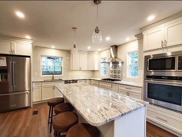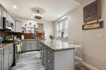 Completely reconfigured kitchen, with custom cabinets, premium countertops, premium tile backsplash, new lighting configuration, and custom finish carpentry.